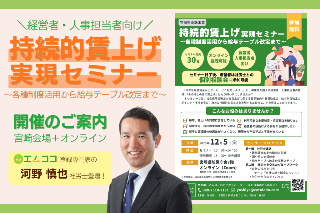 今回は企業の経営者・人事担当者向けセミナー「持続的賃上げ実現セミナー~各種制度活用から給与テーブル改定まで~」開催のご案内をいたします。